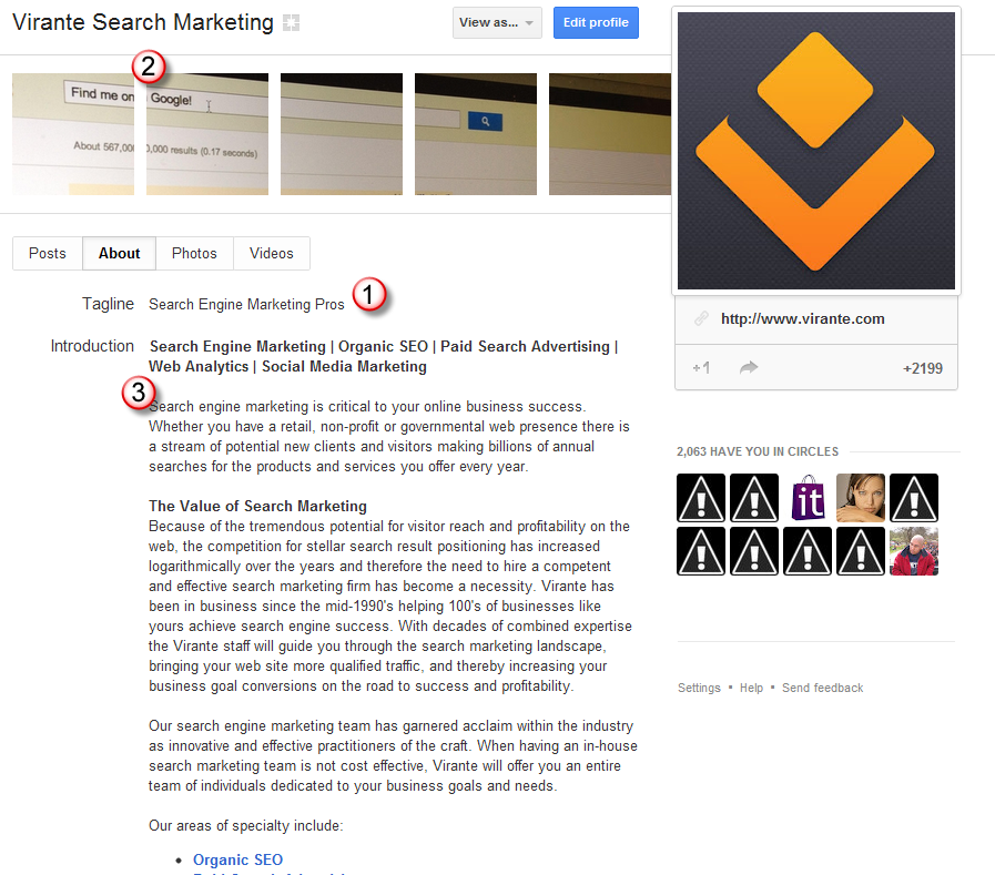 - Feel free to use the Virante G+ Page as a model: https://plus.google.com/u/0/109417353800451599337/about (and please add us to your circles, while you’re there!)