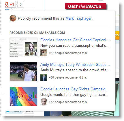 Two weeks ago Google announced to the Google+ Platform Preview Group that they were beginning to test an upgrade to the Google +1 button. The update, until now only visible to members of that group, adds content recommendations to the +1 button when a logged-in-to-Google user hovers the mouse pointer over the button. Here’s what the recommendations look like: