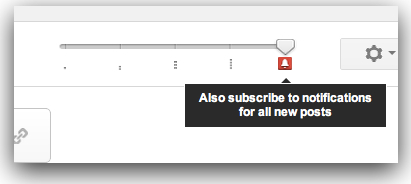 For several months now there has been a slider above the stream view for each of your circles that lets you choose how many or few of the posts in that circle you wanted to see in your mainstream view. Now a new fifth position has been added to those sliders. Setting the slider to this position “subscribes” you to the circle. You will then get notifications for each and every post from anyone you have in that circle.