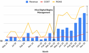 Hive Digital rebuilt conversion tracking to ensure every sale and lead was properly attributed and de‑duplicated. Campaigns were consolidated around intent‑based themes, reducing overlap and wasted spend. Negative keywords were introduced. Automated bidding strategies were reset with clean conversion inputs and realistic target ROAS levels.